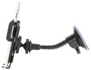 Designed to be fixed in one position but can be easily adjusted if necessary, this holder will accommodate a variety of different sized Smartphones and Tablets for your car, truck, or van. The adjustable holder sits on a lockable ball joint for angular adjustments to get the perfect viewing angle. The holding vice (sides and bottom) can be slid out of their grooves and moved to a wide or narrow grip. Vertical height can be lowered or raised and the main arm can be locked at specific vertical angles. Features a ratcheting suction mount for an extremely tight grip on a window or dash surface.