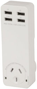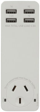 This mains power socket enables you to charge up to four USB powered devices simultaneously (6.8A shared), with a pass-through mains socket allowing you to connect an additional mains powered device. Two USB ports (USB 1 & 2) feature smart IQ technology that can auto-detect a connected iOS® or Android device and charge it with the optimum charging current. USB port 3 provides up to 2.4A output to charge tablets and iPads, and USB port 4 provides up to 1A for Smartphones and smaller USB powered gadgets. Safety features include surge protection, over-current, over-voltage, over-temperature, and short-circuit protection. Power status LED indicator. SAA approved.