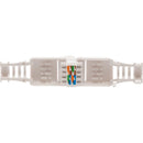 The PK3998 Toolless CAT5e plugs do not require any crimp or punch-down tool to fit! Simply strip approximately 15mm of cable insulation and place the still insulated conductorsinto the correct, colour-coded slots of the loading bar. Squeezing the boot closed until latched will push the conductors securely into the IDC termination clamps finishing the connections.