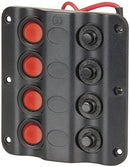 This panel meausres 100 x 110 overall and can be mounted either vertically or horizontally. The circuit breakers are connected in common + by a soldered strip which accepts a 1/4 QC connector. They are then soldered to a 10A rated illuminated rocker switch. The rocker switches have 4.8 QC tabs and are single pole type. The circuit breakers are rated thus: 10A, 8A, 6A and 4A which is quite handy really.