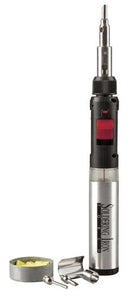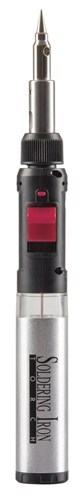 A sturdy, portable, self-igniting butane powered gas soldering iron tool kit with 3 tips. Produces a 1300°C adjustable flame for low end brazing, tin/plastic melting, automotive repair work, welding and of course heat shrinking. Supplied with 3 interchangeable metal tips for PCB work. For extra convenience the torch has a handy retractable stand so you can rest it somewhere without worrying about it rolling around. It is supplied in a plastic carry case that includes a cleaning sponge, extra tips, a deflector and a cap for the soldering iron.