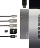 Plugs into the two USB Type-C ports on a compatible MacBook Pro laptop to provide a USB 3.1 Gen 1 Type-C port, two USB 3.0 Type A ports, a microSD port, SD card port, and a HDMI port that supports up to 4K. A Thunderbolt 3 pass-through port enables powering the laptop at the same time.