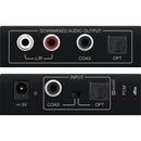 Downmixes 5.1ch Dolby Audio and DTS Audio from optical Toslink or coaxial digital audio input signals from a compatible source device to 2ch stereo audio