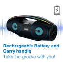 THE FUNKY RGB LIGHTING ON THE SPEAKERS AND CARRY HANDLE ADDS A TOUCH OF FUN PARTY VIBES TO YOUR GATHERINGS.