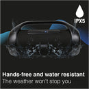 THE WATER RESISTANCE RATING MEANS THE SPEAKER CAN KEEP WORKING NO MATTER THE WEATHER AND THE BUILT-IN RECHARGEABLE BATTERY WITH OVER 9 HOURS RUNTIME KEEPS THE SPEAKER GOING FOR A FULL DAY AT WORK OR A FAMILY BARBEQUE.