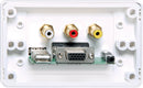 Through connection type VGA plates are fitted with HD9 female VGA connector, 3.5mm audio, USB type A and three RCA connections. Includes through connections for easy on-site termination.