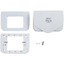 This is your standard 2 x 240V outlet socket that you would normally see on a wall inside a house, except that it has a clip-down weatherproof cover. The function of the unit, "OUTLET Double Pole 10A" is clearly stamped on the outside. Under the hinged and snap shut cover are two rubber water protected on-off switches and waterproof pilot lights. The whole thing is IP65, which makes it very water resistant. The unit itself comes with a 7mm sealing gasket and mounting screws, and 13mm spacer/mounting flange.