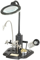 The multi-purpose tool offers an excellent all round solution, ideal for working on small to medium PCBs, components, soldering etc. The magnifying lamp with integrated 3rd hand is intended for illuminating work areas and it is equipped with a magnifying glass. This device also comes with a soldering iron stand, alligator clips, soldering wire spool holder,sponge as well as a cleaning ball. Powered by 4 AA batteries (not supplied).