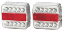 Regular bulb failures in your trailer lights are not only a pain in the posterior, but also quite dangerous to your fellow road users. Switching to LED alternatives solves this problem completely, since LEDs are not at all affected by shock and vibration, last over 50,000 hours, use a fraction of the power, and are actually more visible to other road users. These trailer lights are an "all-in-one" solution measuring only 100mm wide by 90mm high, and providing all the legal illumination needs of a caravan, boat trailer, camping trailer etc., being; Stop, Tail, Turn and number plate illumination, along with a red reflector panel. The housing is submersible which is perfect for boat trailers, and each light is fitted with a connector and matching 200mm wiring harness to allow for easy installation.